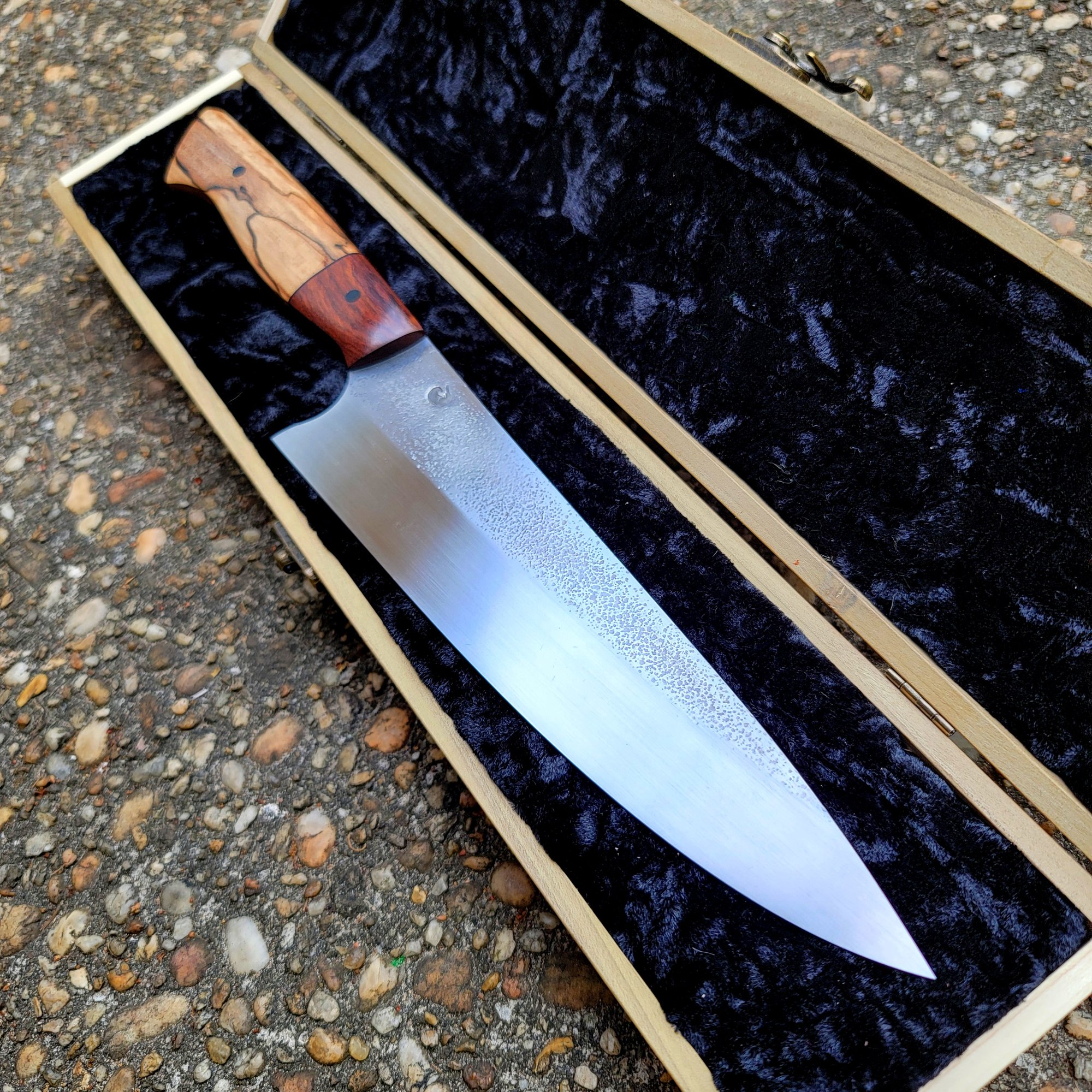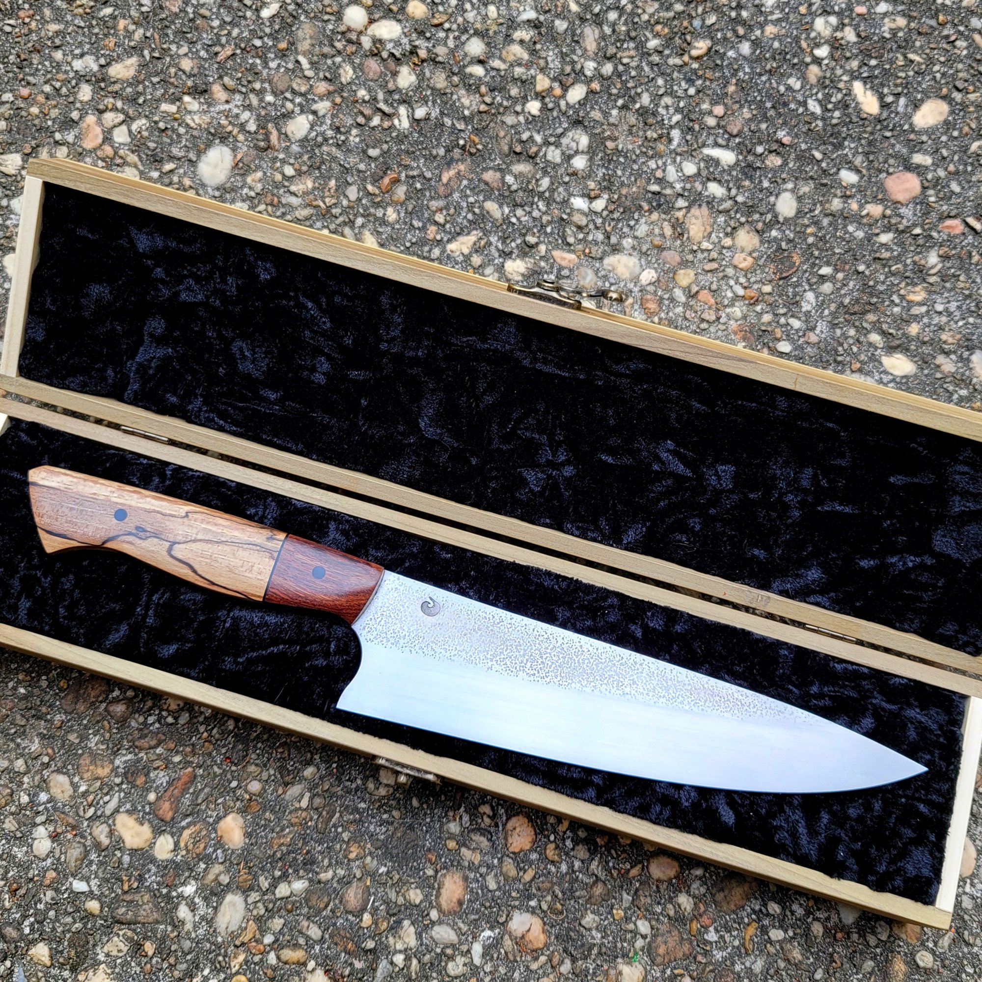 This 8-inch chef’s knife is a true kitchen workhorse. It boasts hammer-textured flats and satin-smooth bevels. The blade, crafted from 3/32-inch thick carbon steel, measures 2 inches wide at the heel. The in-house heat treatment ensures a long-lasting, sharp edge.