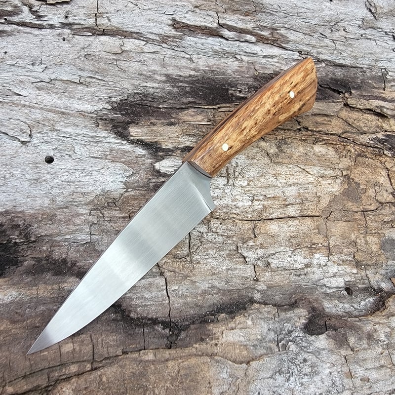 Crafted with a stunning spalted hickory wood handle and a sharp 3.5" blade made from 1084 high-carbon steel, this 7" knife cuts like a dream. Perfect for all your everyday kitchen tasks, it's lightweight, durable, and sure to become your "go-to" knife.