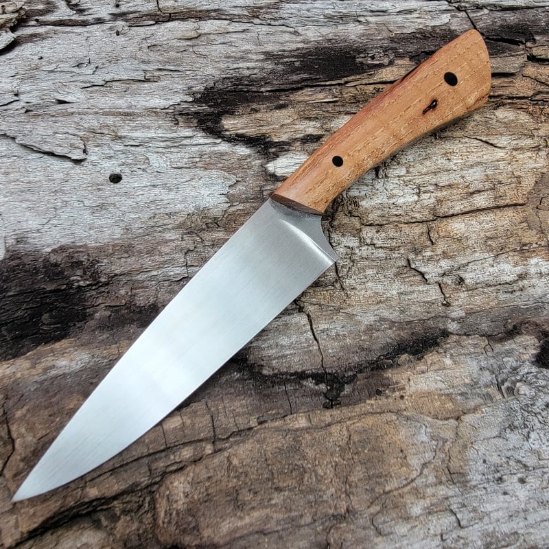 Crafted with a stunning curly pecan wood handle and a sharp 3.5" blade made from 1084 high-carbon steel, this 7" knife cuts like a dream. Perfect for all your everyday kitchen tasks, it's lightweight, durable, and sure to become your "go-to" knife.
